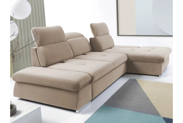 Komfortná rohová sedacia súprava s otomanom vpravo, zaujme moderným zaobleným dizajnom. Najväčšou prednosťou sú funkcie polohovania sedačky – vďaka nim si ľahko prispôsobíte každodenné pohodlie podľa vašej aktuálnej potreby. Obľúbite si funkcie polohovania sedadla, polohovanie horných opierok a polohovanie bočných podrúčiek. Rozkladaciu funkciu na lôžko alebo úložný priestor, naopak oceníte kvôli praktickosti. Sedačka je očalúnená odolnou látkou vo farbe béžová, ktorá je veľmi príjemná na dotyk.