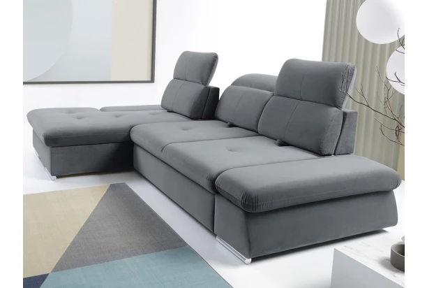 Komfortná rohová sedacia súprava s otomanom vľavo zaujme moderným zaobleným dizajnom. Najväčšou prednosťou sú funkcie polohovania sedačky – vďaka nim si ľahko prispôsobíte každodenné pohodlie podľa vašej aktuálnej potreby. Obľúbite si funkcie polohovania sedadla, polohovanie horných opierok a polohovanie bočných podrúčiek. Rozkladaciu funkciu na lôžko alebo úložný priestor naopak oceníte kvôli praktickosti. Sedačka je očalúnená mäkkou látkou vo farbe oceľovo šedá, ktorá je veľmi príjemná na dotyk.