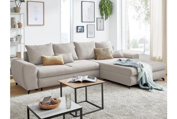 Atraktívna rohová sedacia súprava so zaoblenými tvarmi ponúka príjemne mäkký štýl sedenia pre Váš každodenný komfort. Očalúnená látkou vo farbe svetlo béžová. Ďalšou pridanou hodnotou je praktický úložný priestor a navyše rozkladacia funkcia – vďaka nej sa sedačka ľahko premení na príležitostné lôžko napríklad na návštevu. Vďaka univerzálne riešenej konštrukcii je možné sedačku zostaviť ako pravý alebo ľavý roh, respektíve s otomanom na pravej alebo ľavej strane – sedačka sa tak lepšie prispôsobí priestorovým možnostiam Vašej obývačky.
