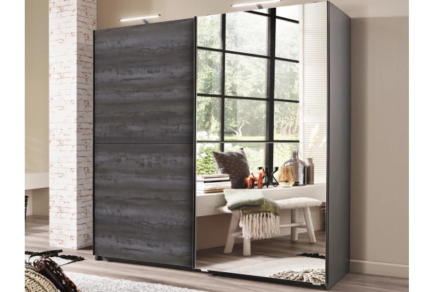 Šatníková skriňa so zrkadlom a posuvnými dverami so šírkou 180 cm ,zaujme na pohľad imitáciou šedej vintage ocele. Ideálne doplní mladistvý interier v mestskom industriálnom štýle.