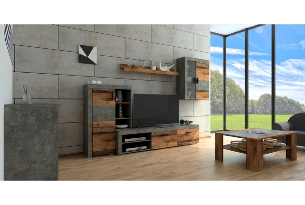 Obývacia stena Pico, tmavý betón/vintage optika dreva, s osvetlením