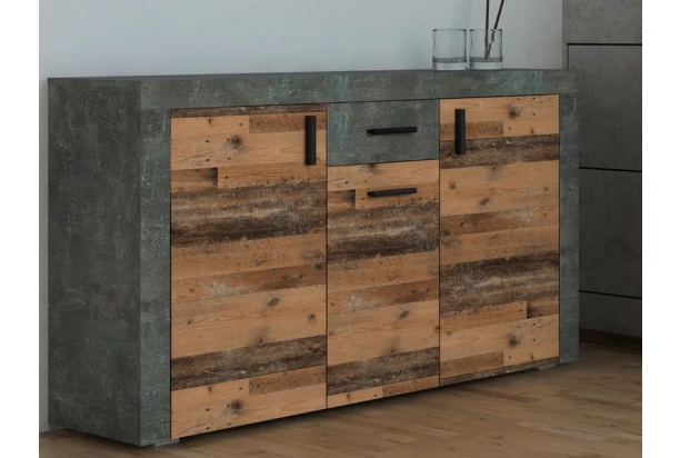 Praktická úložná komoda o šírke 130 cm v kombinácii tmavo šedého betónu s vintage optikou drevených dosiek – zaujme na pohľad a dokonale doplní štýlovo zariadený byt.