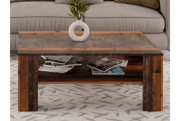 Praktický obdĺžnikový konferenčný stolík v kombinácii tmavo šedého betónu s vintage optikou drevených dosiek – zaujme na pohľad a dokonale doplní štýlovo zariadenú obývačku.