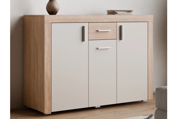 Praktická úložná komoda so šírkou 130 cm v kombinácii dub jantárový/béžový kašmír – svetlý a zároveň veľmi útulný nábytok, ktorý vytvorí príjemné domáce prostredie.