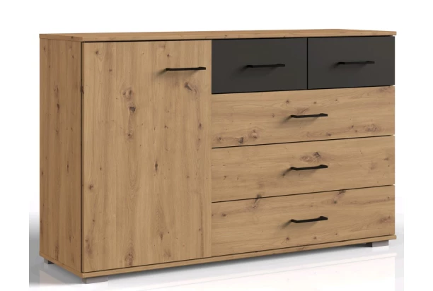 Komoda so zásuvkami z programu Coventry o šírke 130 cm obsahuje 1 otočné dvere a 5 úložných zásuviek o rôznych veľkostiach pre prehľadné ukladanie. Vyrobená v pôsobivej kombinácii útulného drevodekoru dub artisan s imitáciou antracitovej brúsenej ocele. Praktický a zároveň moderný nábytok pre Váš útulný domov.