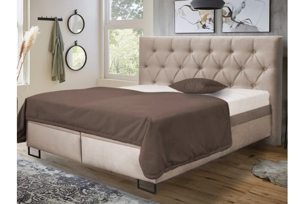 Štýlová manželská posteľ s veľkosťou lôžka 180×200 cm je očalúnená s príjemnou hebkou látkou v odtieni béžová latté. Vysoké prešívané čelo s dekoračnými gombíkmi pôsobí luxusným dojmom. O kvalitnú oporu počas spánku alebo relaxácie sa postarajú rošty s funkciou polohovania. Vďaka praktickému úložnému priestoru pod lôžkom bude pre Vás ukladanie posteľnej bielizne alebo sezónnych vecí ľahšou záležitosťou a ušetríte tak úložné miesto v spálni.