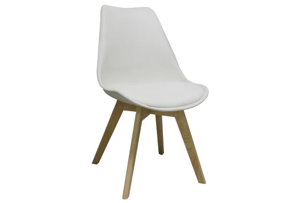Jedálenská stolička v modernom severskom štýle zaujme masívnou drevenou podnožou a zaobleným pružným sedákom v bielom prevedení.