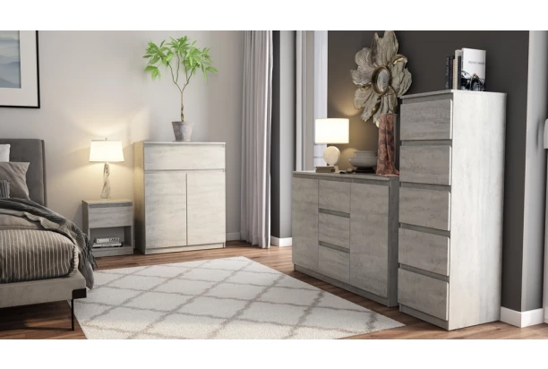 Komoda so šírkou 120 cm s 3 zásuvkami v imitácii šedého betónu, ponúka praktické úložné priestory, účelnosť a čisté línie tvarov, ktoré sa hodia do každého interiéru.