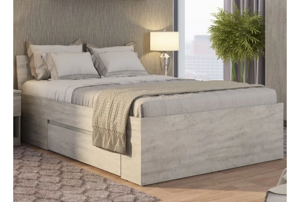 Posteľ s rozmerom lôžka 140×200 cm v imitácii šedý betón, ponúka praktické úložné zásuvky, účelnosť a čisté línie tvarov, ktoré sa hodia do každého interiéru.