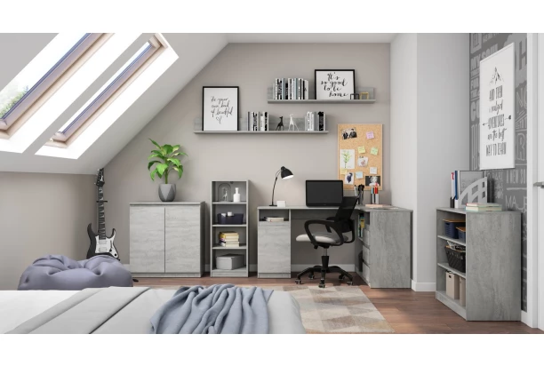 Rohový písací stôl v imitácii sivý betón ponúka praktické úložné priestory z oboch strán, účelnosť a čisté línie tvarov, ktoré sa hodia do každého interiéru.