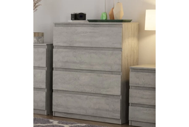 Komoda so šírkou 75 cm so 4 zásuvkami v imitácii šedého betónu, ponúka praktické úložné priestory, účelnosť a čisté línie tvarov, ktoré sa hodia do každého interiéru.