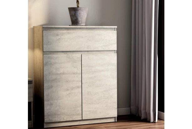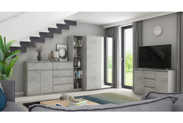 Skrinka so zásuvkou o šírke 80 cm v imitácii šedého betónu, ponúka praktické úložné priestory, účelnosť a čisté línie tvarov, ktoré sa hodia do každého interiéru.