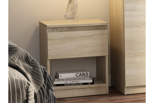 Skrinka/nočný stolík v dekore dub sonoma ponúka praktické úložné priestory, účelnosť a čisté línie tvarov, ktoré sa hodia do každého interiéru.