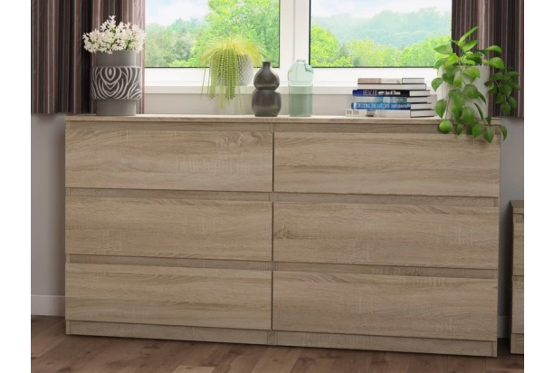 Široká komoda o šírke 150 cm v dekore dub sonoma ponúka praktické úložné priestory, účelnosť a čisté línie tvarov, ktoré sa hodia do každého interiéru.