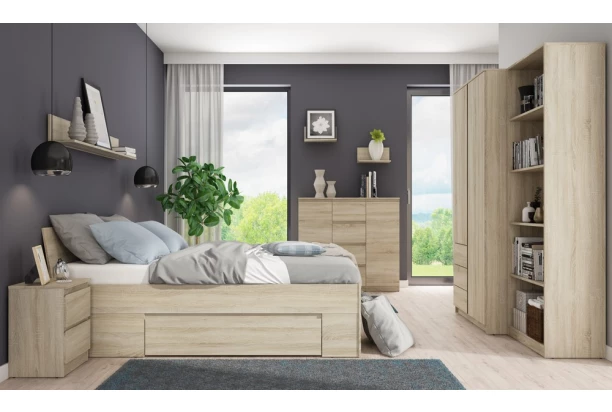 Posteľ o rozmere lôžka 140×200 cm v dekore dub sonoma ponúka praktické úložné zásuvky, účelnosť a čisté línie tvarov, ktoré sa hodia do každého interiéru.