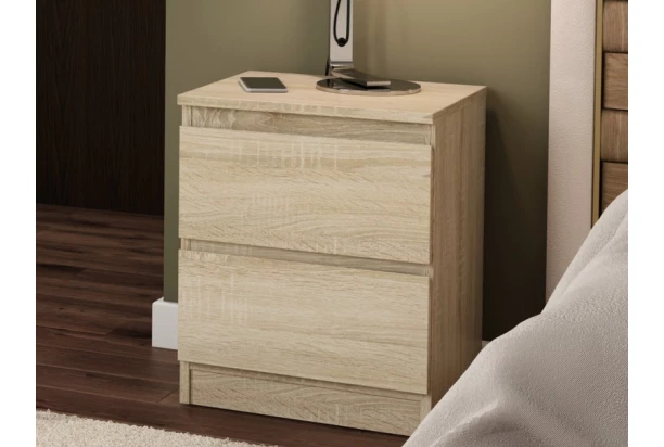 Skrinka/nočný stolík s 2 zásuvkami v dekore dub sonoma ponúka praktické úložné priestory, účelnosť a čisté línie tvarov, ktoré sa hodia do každého interiéru.