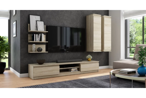 TV stolík o šírke 175 cm v dekore dub sonoma ponúka praktické úložné priestory, účelnosť a čisté línie tvarov, ktoré sa hodia do každého interiéru.