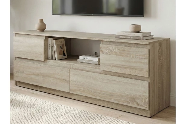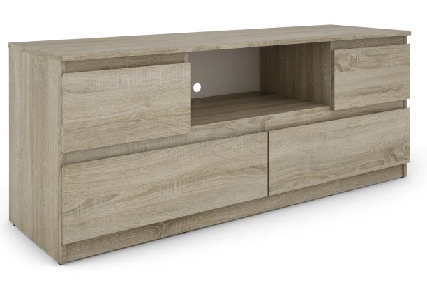 TV skrinka so šírkou 140 cm v dekore dub sonoma ponúka praktické úložné priestory, účelnosť a čisté línie tvarov, ktoré sa hodia do každého interiéru. TV stolík je vybavený otvorenou priehradkou na umiestnenie elektroniky, dvoma priestrannými zásuvkami a dvoma výklopnými dvierkami, ktoré elegantne skryjú ďalšie drobnosti a príslušenstvo.