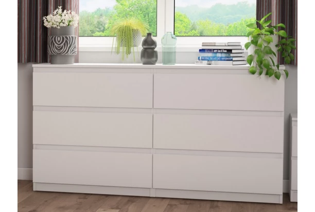 Široká komoda o šírke 150 cm v bielej farbe ponúka praktické úložné priestory, účelnosť a čisté línie tvarov, ktoré sa hodia do každého interiéru.