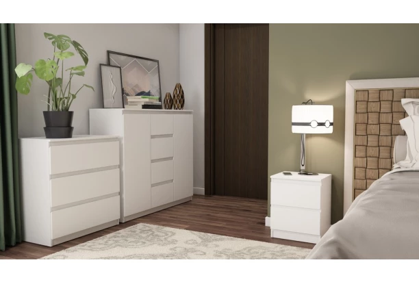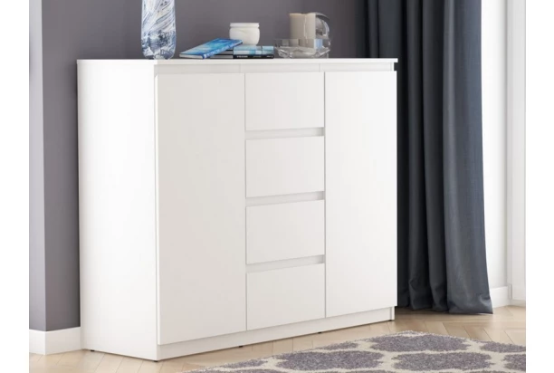 Široká komoda so šírkou 120 cm v bielej farbe ponúka praktické úložné priestory, účelnosť a čisté línie tvarov, ktoré sa hodia do každého interiéru.