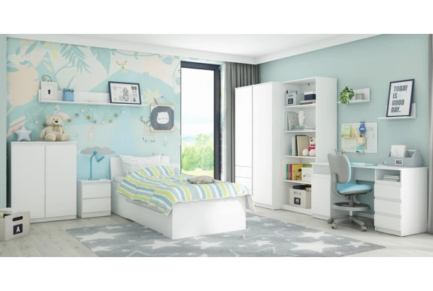 Posteľ s rozmerom lôžka 90×200 cm v bielej farbe, ponúka praktické úložné zásuvky, účelnosť a čisté línie tvarov, ktoré sa hodia do každého interiéru.
