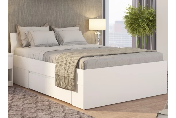 Posteľ o rozmere lôžka 140×200 cm v bielej farbe ponúka praktické úložné zásuvky, účelnosť a čisté línie tvarov, ktoré sa hodia do každého interiéru.