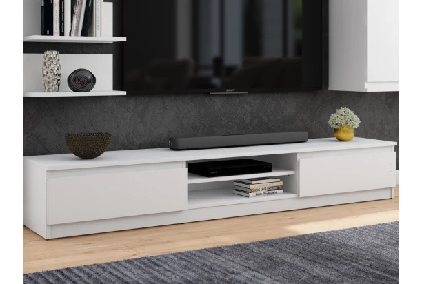 TV stolík v šírke 175 cm v bielom prevedení ponúka praktické úložné priestory, účelnosť a čisté línie tvarov, ktoré sa hodia do každého interiéru.