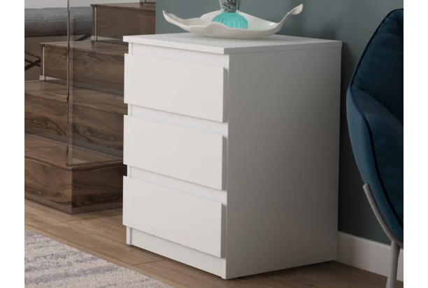 Malá skrinka alebo tiež vysoký nočný stolík s 3 zásuvkami v bielej farbe ponúka praktické úložné priestory, účelnosť a čisté línie tvarov, ktoré sa hodia do každého interiéru.