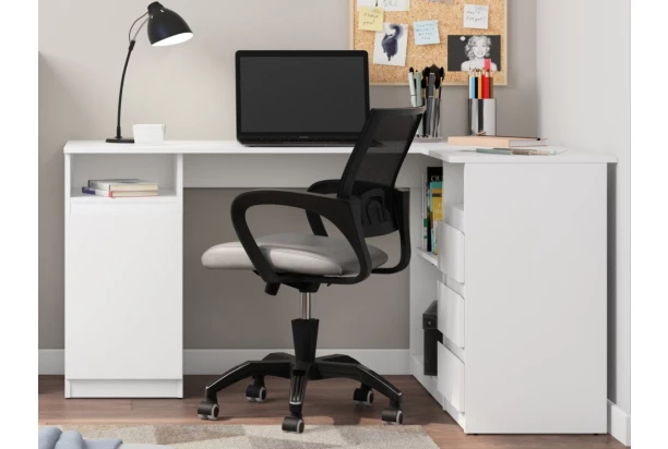 Rohový písací stôl v bielej farbe ponúka praktické úložné priestory z oboch strán, účelnosť a čisté línie tvarov, ktoré sa hodia do každého interiéru.