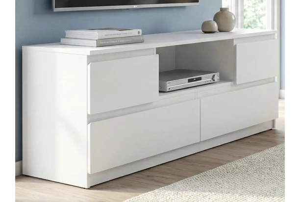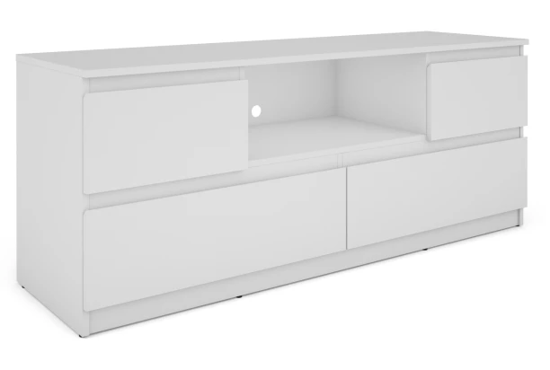 TV skrinka so šírkou 140 cm v bielej farbe ponúka praktické úložné priestory, účelnosť a čisté línie tvarov, ktoré sa hodia do každého interiéru. TV stolík je vybavený otvorenou priehradkou na umiestnenie elektroniky, dvoma priestrannými zásuvkami a dvoma výklopnými dvierkami, ktoré elegantne skryjú ďalšie drobnosti a príslušenstvo.