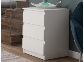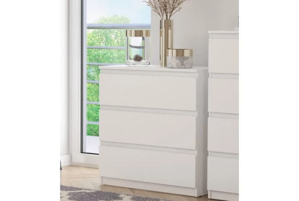 Zásuvková komoda s výškou 80 cm v bielej farbe ,obsahuje 3 zásuvky a ponúka praktické úložné priestory, účelnosť a čisté línie tvarov, ktoré sa hodia do každého interiéru.
