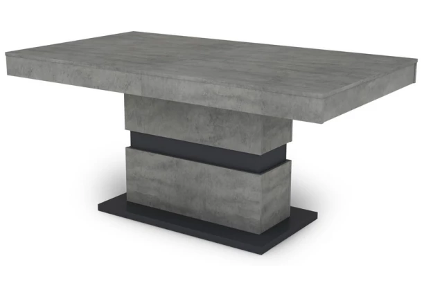 Moderný jedálenský stôl v obdĺžnikovom tvare, oceníte pre jeho priestrannosť. Zaujme mohutnou optikou v kombinácii grafitu a imitácie šedého betónu. Vďaka rozkladacej funkcii, pohostíte akúkoľvek návštevu Vašej rodiny alebo priateľov. Šírku jedálenskej plochy ľahko rozšírite z pôvodných 160 cm na 220 cm.