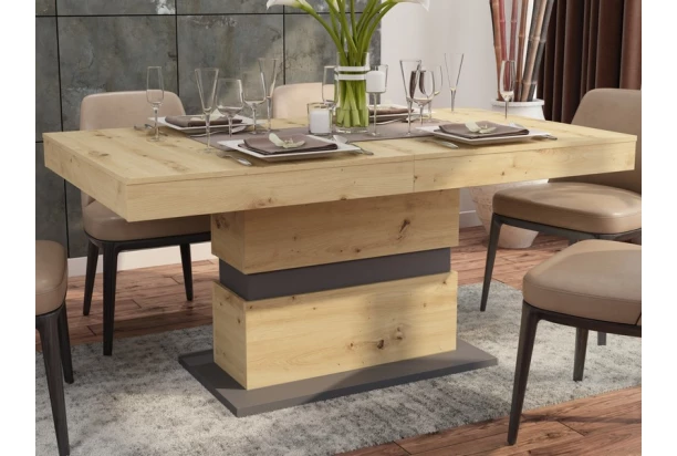 Moderný jedálenský stôl v obdĺžnikovom tvare oceníte pre jeho priestrannosť. Zaujme mohutnou optikou v kombinácii grafitu a dekoru dub artisan. Vďaka rozkladacej funkcii pohostíte akúkoľvek návštevu Vašej rodiny alebo priateľov. Šírku jedálenskej plochy ľahko rozšírite z pôvodných 160 cm na 220 cm.