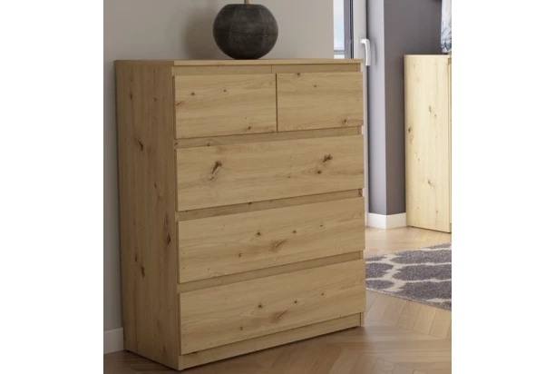 Komoda s 5 zásuvkami o šírke 75 cm v dekore dub artisan ponúka praktické úložné priestory, účelnosť a čisté línie tvarov, ktoré sa hodia do každého interiéru.