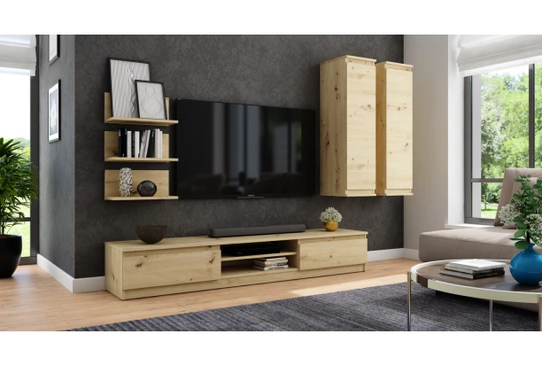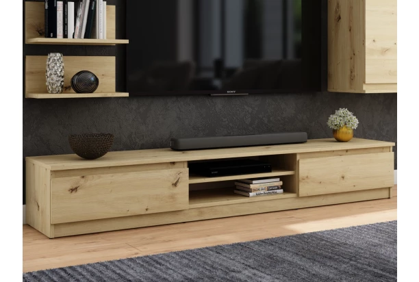 TV stolík o šírke 175 cm v dekore dub artisan ponúka praktické úložné priestory, účelnosť a čisté línie tvarov, ktoré sa hodia do každého interiéru.