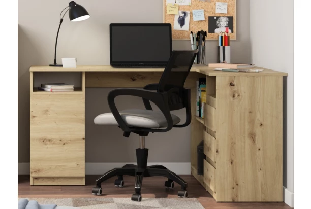 Rohový písací stôl v dekore dub artisan ponúka praktické úložné priestory z oboch strán, účelnosť a čisté línie tvarov, ktoré sa hodia do každého interiéru.