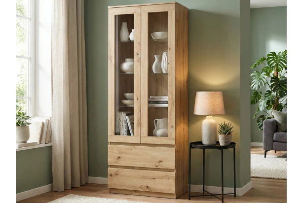 Vysoká vitrína so šírkou 70 cm v dekore dub artisan ponúka praktické úložné priestory, účelnosť a čisté línie tvarov, ktoré sa hodia do každého interiéru. Za otočnými presklenými dvierkami sa nachádzajú 3 sklenené police, kam môžete vystaviť dekorácie, fotky alebo poháre. Do 2 spodných šuplíkov môžete uschovať dokumenty, textil alebo iné drobnosti. Táto úzka vitrína s presklením skvele zapadne do obývacej izby, jedálne i spálne.