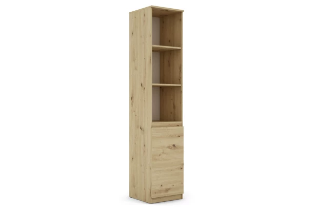 Úzky regál s dvierkami so šírkou 40 cm v dekore dub artisan ponúka praktické úložné priestory, účelnosť a čisté línie tvarov, ktoré sa hodia do každého interiéru. Odkladacie police sú ideálne na vystavenie kníh, dekorácií a ďalších predmetov. Za otočnými dvierkami sa skrýva praktický úložný priestor s policou, ktorý vám pomôže udržať poriadok v domácnosti.