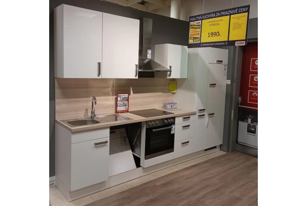 Kompletná zostava kuchyne B-line – extra výhodný odpredaj tovaru z predajne Nitra. V prevedení biela lesk/akácia.