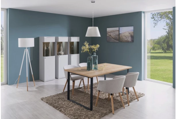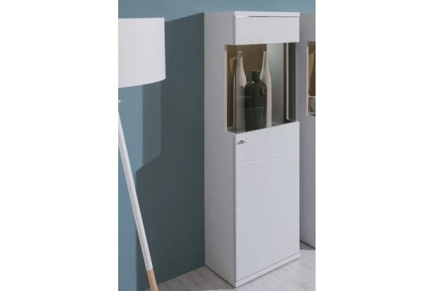Ak máte radi moderný dizajn a zároveň kvalitu, potom je vitrínová skrinka Laval, práve pre Vás. Matné bledo šedé plochy a útulný drevodekor duba artisan ,dokresľujú frézované geometrické línie predných plôch, ktoré nábytku dodávajú zaujímavú optiku. Polovysoká vitrína ponúka miesto pre dekorácie i úložný priestor.