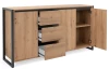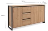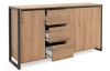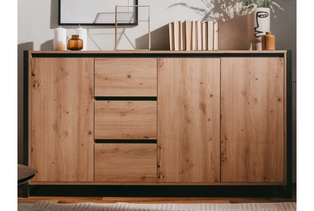 Široká komoda v kombinácii dverí a zásuviek z kolekcie Denver – nábytok v mestskom industriálnom štýle, pôsobí veľmi moderne a dáva Vám možnosť vytvárať dizajnové interiery v mladistvom duchu. Príjemné útulné tóny drevodekoru dub artisan, dopĺňajú antracitovo šedé línie a široké bočné rámy, vďaka ktorým je nábytok nezameniteľný.