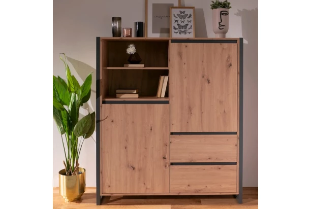 Vysoká skrinka v kombinácii dverí, zásuviek a otvorených priehradiek z kolekcie Denver – nábytok v mestskom industriálnom štýle, pôsobí veľmi moderne a dáva Vám možnosť vytvárať dizajnové interiery v mladistvom duchu. Príjemné útulné tóny drevodekoru dub artisan, dopĺňajú antracitovo šedé línie a široké bočné rámy, vďaka ktorým je nábytok nezameniteľný.