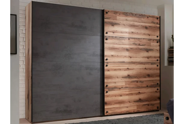 Užite si nevšednú atmosféru domova s nábytkom, ktorý zaujme už na pohľad – šatníková skriňa s posuvnými dverami s celkovou šírkou 270 cm v imitácii tmavého šedého betónu a alpských zrubových dosiek je inšpirovaná atraktívnym industriálnym dizajnom. Spojenie tradičnej optiky dreva s netradičným betónom, pôsobí moderne a pritom veľmi útulne.