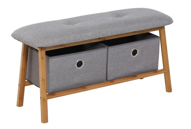 Malá drevená lavica s 2 úložnými boxmi, má mäkko polstrovaný sedák a vytvorí útulné domácke prostredie. Využitie nájde v predsieni alebo i v kúpeľni. Do úložných boxov ľahko uložíte domácu obuv, drobné doplnky alebo napríklad uteráky.