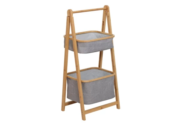Malý drevený regál s 2 látkovými košíky pre ukladanie doplnkov, drobného prádla alebo napríklad uterákov. Veľkostne ideálne do kúpeľne, komory i šatne, kde vytvorí útulné domácke prostredie. Vďaka skladacej konštrukcii možno ľahko uschovať.