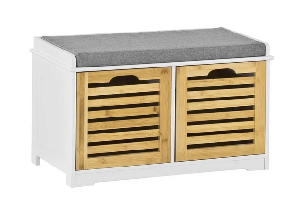 Biela lavica s 2 drevenými zásuvkami a mäkkým sedacím vankúšom vytvori útulné domácke prostredie. Poslúži ako malý predsieňový botník alebo univerzálny úložný priestor na drobnosti.