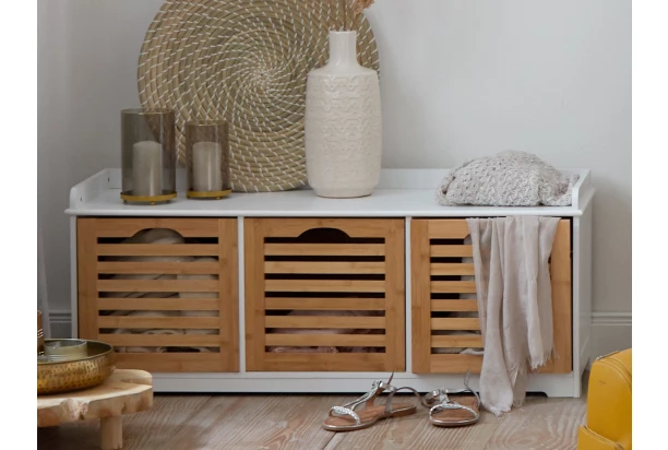 Biela lavica s 3 drevenými zásuvkami a mäkkým sedacím vankúšom vytvoria útulné domácke prostredie. Poslúži ako malý predsieňový botník alebo univerzálne úložný priestor na drobnosti.