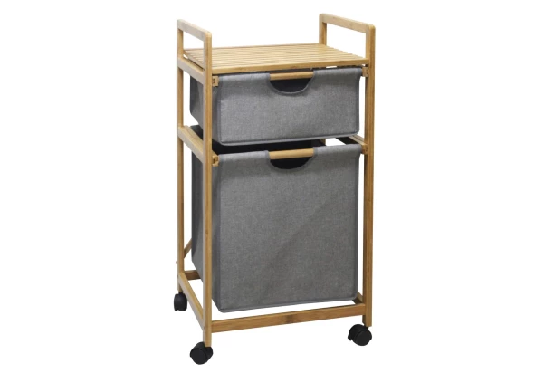 Malý drevený regál s odkladacou plochou, látkovou zásuvkou a bielizňovým košom ,vytvorí útulné domácke prostredie. Veľkostne ideálny do akejkoľvek kúpeľne alebo šatne.