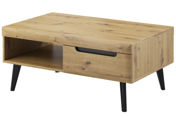 Konferenčný stolík so zásuvkami z kolekcie Nord – inšpirujte sa útulným severským štýlom. Moderný nábytok so zaoblenými hranami, dopĺňajú masívne drevené nôžičky, ktoré dodávajú interiéru ľahkosť a svieži vzhľad. Teplé tóny drevodekoru podkresľujú tmavé čelné línie, vďaka ktorým nábytok skvelo vynikne.