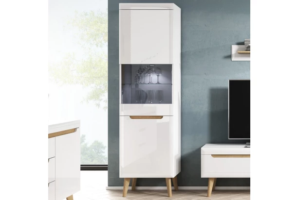 Vysoká vitrína z kolekcie Nordi – inšpirujte sa útulným severským štýlom. Moderný nábytok so zaoblenými hranami dopĺňajú masívne drevené nožičky, ktoré dodávajú interiéru ľahkosť a svieži vzhľad. Leskle biele plochy podkresľujú čelné línie v dubovom drevodekóre, vďaka ktorým nábytok skvele vynikne.